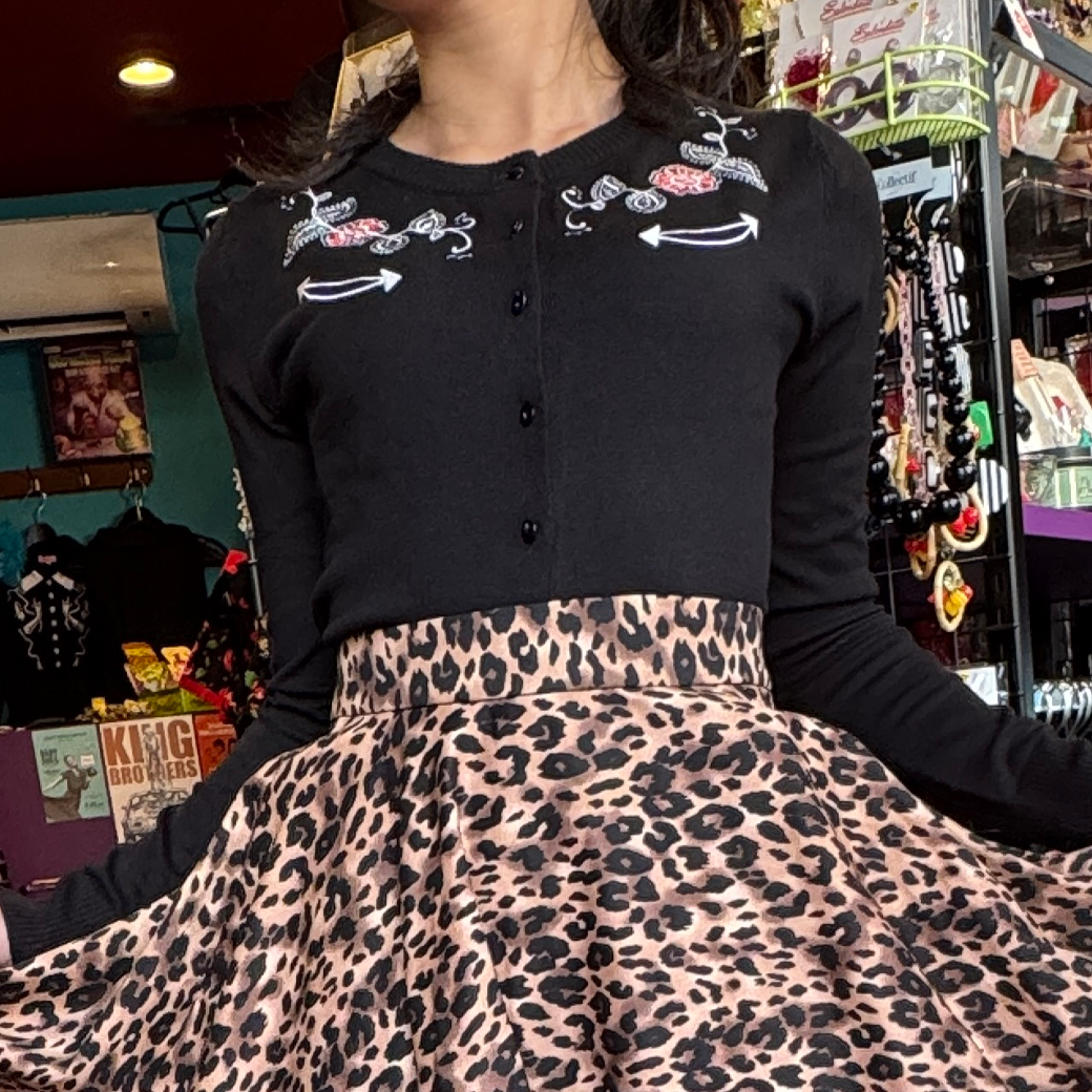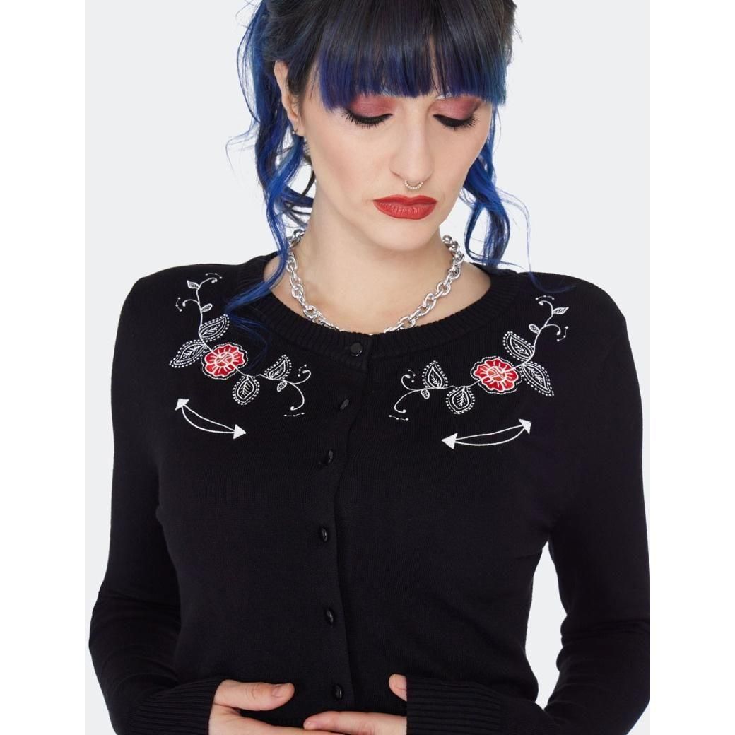 赤と白の刺繍でウエスタンフラワーやリーフ、アローのディテールをあしらった長袖のニットカーディガン