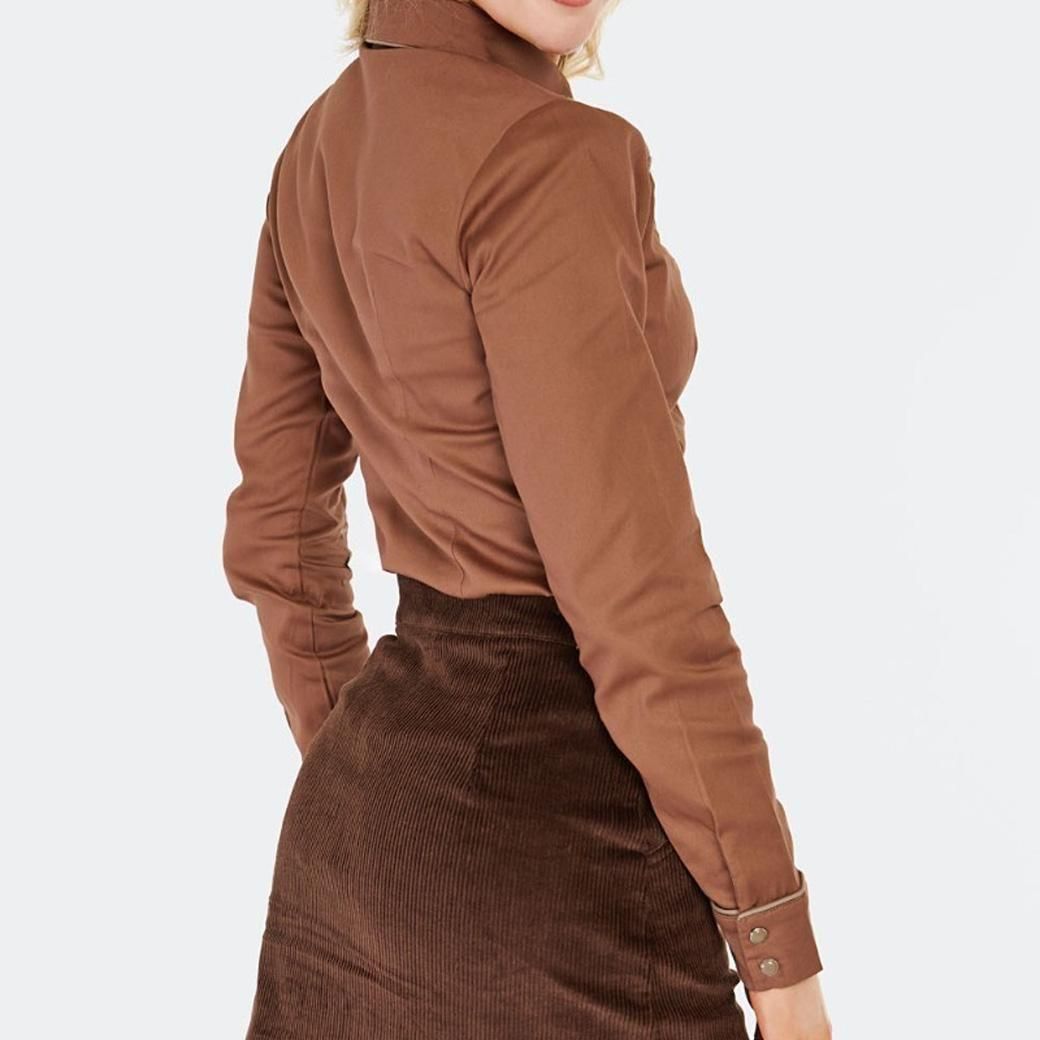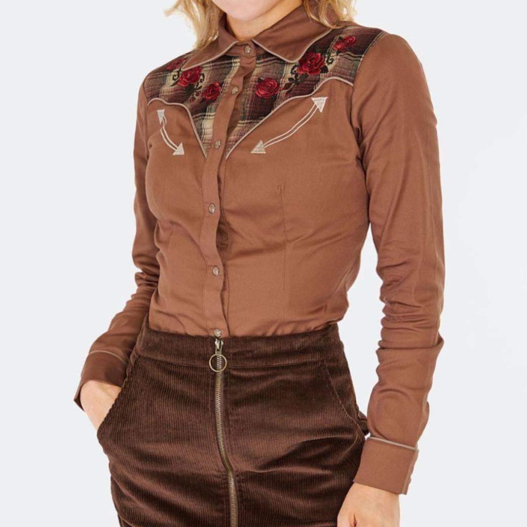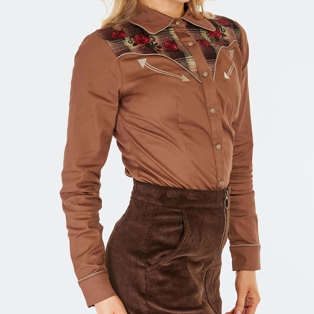 チェック柄のヨークパネルにはローズ刺繍、ウエスタン風のフェイクポケットをモチーフにした刺繍が目を惹きます
