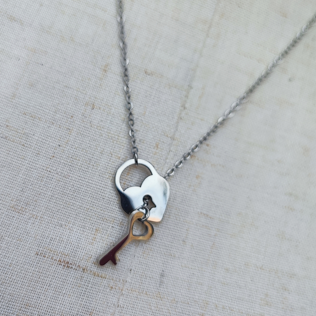 コーデの邪魔をしない小ぶりでさりげないサイズ感ながら存在感のあるハートの南京錠と鍵モチーフのネックレス。