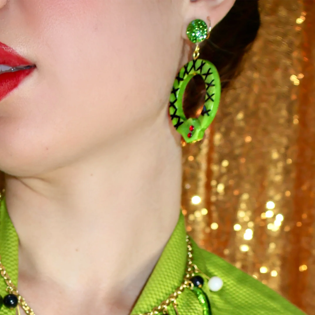 赤いストーンの目が輝く、光沢のあるグリーンのヘビがカールしたデザインのピアスはまさに目を引く逸品