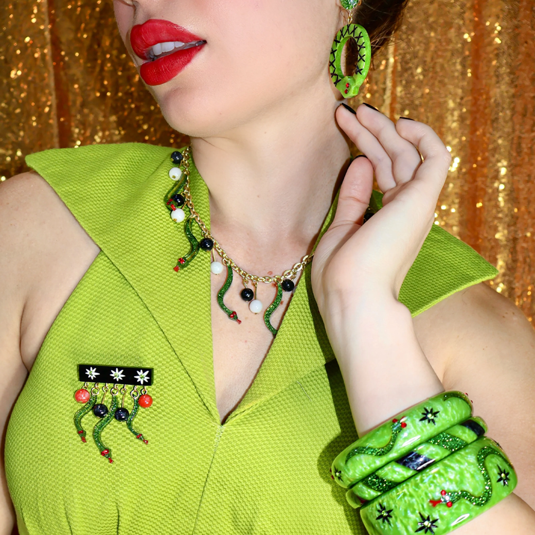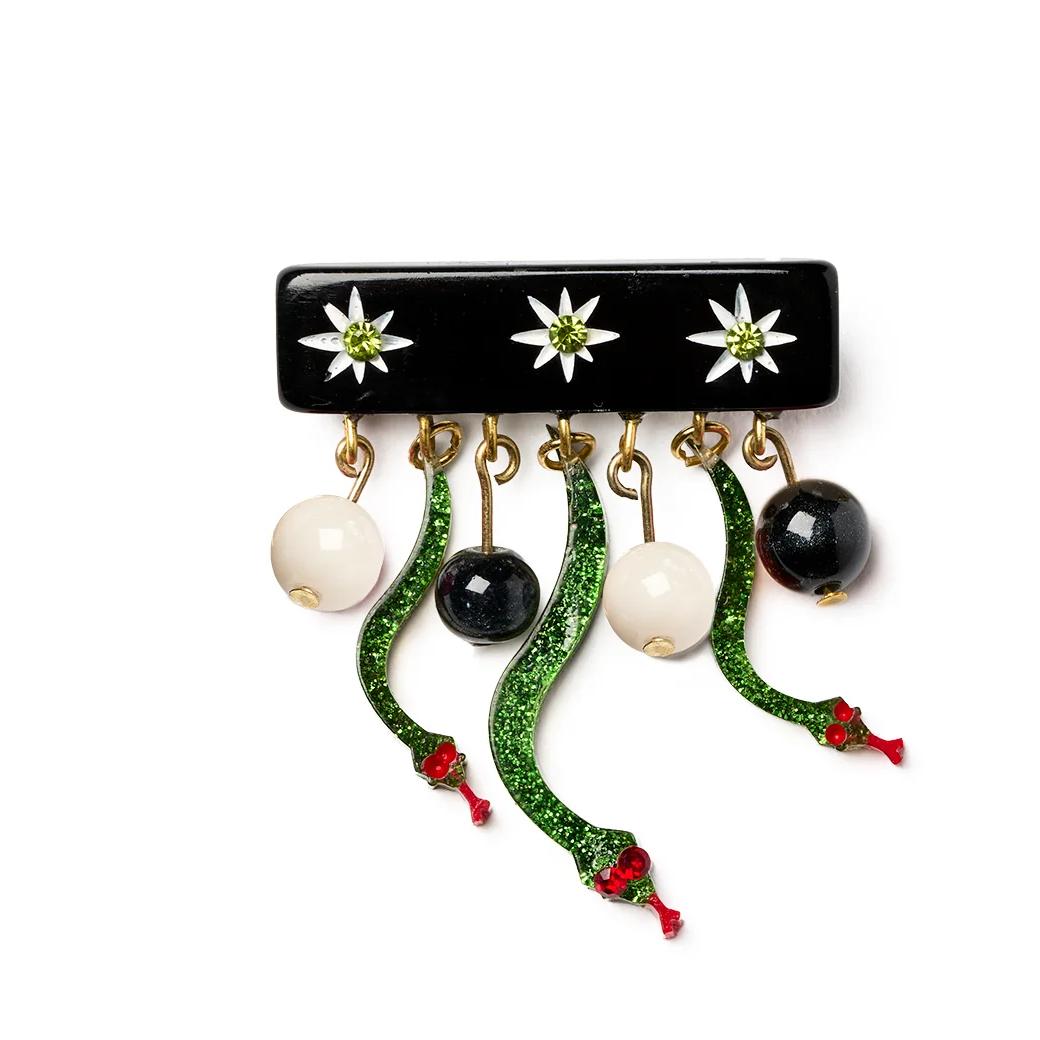 スリザーブローチは、不気味な雰囲気で会話のきっかけを演出します。グリーンのグリッター樹脂製の蛇に宝石がちりばめられ、ゴールドトーンのチェーンから垂れ下がり、ミッドセンチュリーとハロウィンを融合させたような存在感を放ちます。