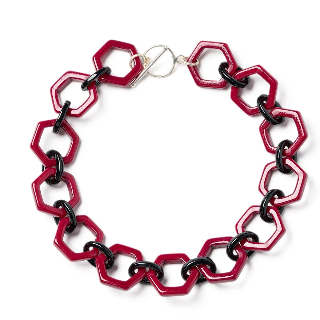 ブラックと温かみのあるピンクトーンの六角形のリンクネックレス