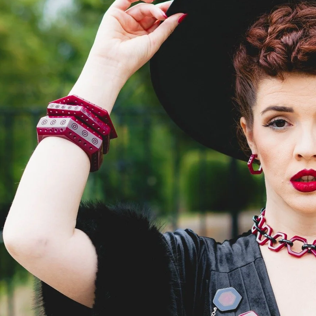 ワイドクラッシュバングルは、ヴィンテージ風の重ねづけにローズゴールドの輝きを添えます。1930年代のベークライトにインスパイアされた、ゴールドの輝きを放つ六角形のバングルは、タイムレスでありながら印象的な輝きを放ちます。