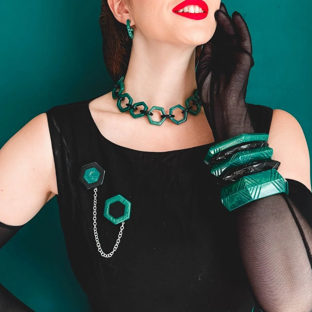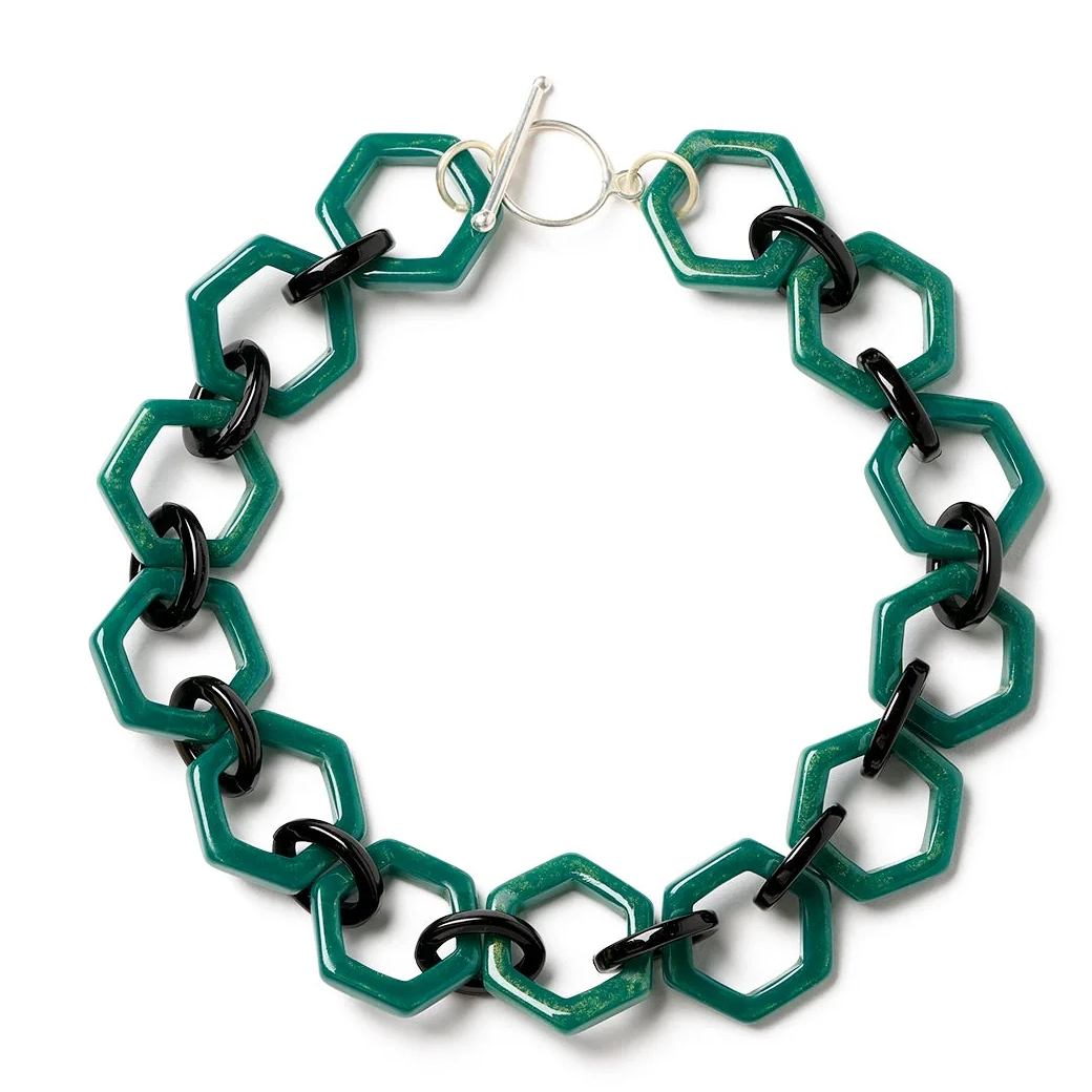 ブラックと鮮やかなグリーンの六角形のリンクネックレス