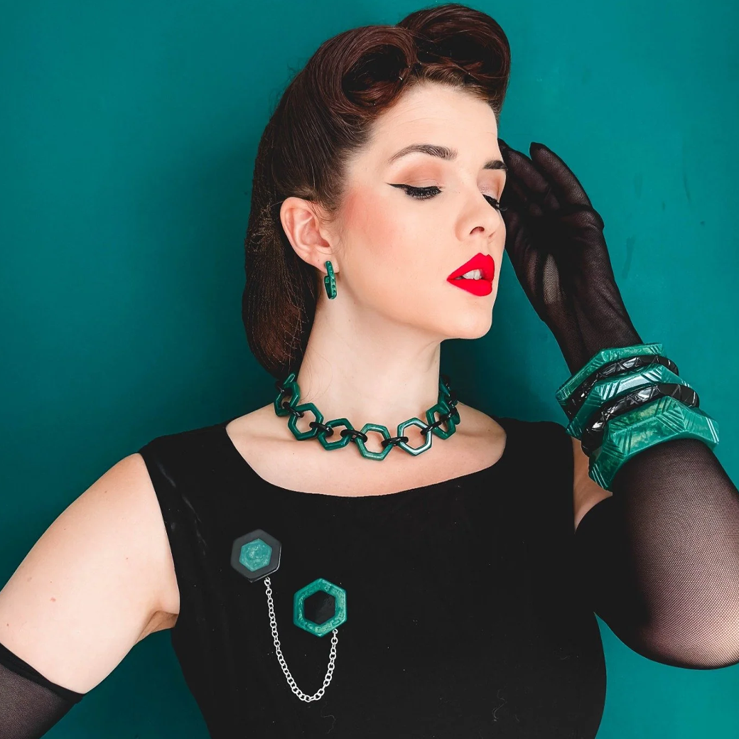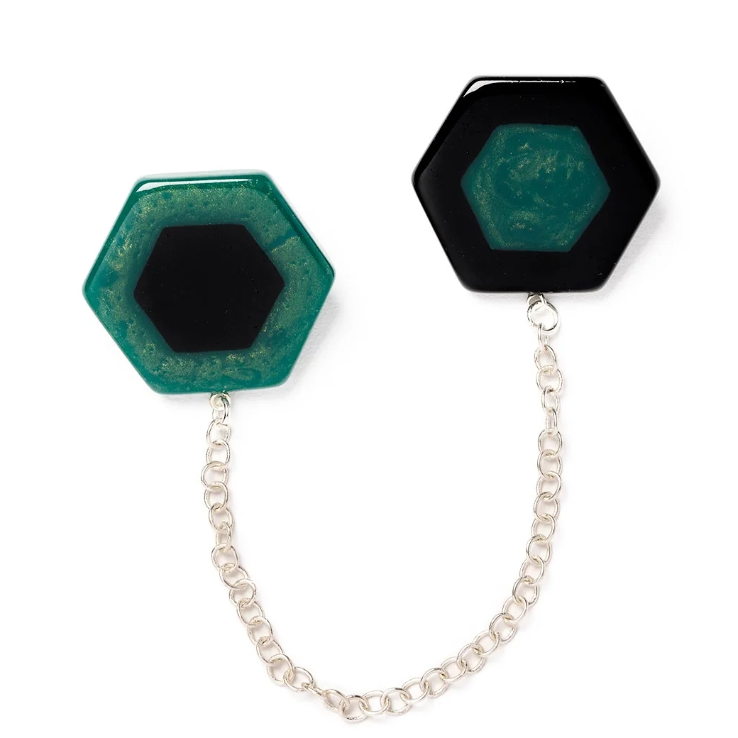 ジェダイトダブルブローチで、大胆なデコスタイルを装いにプラス。グリーンの樹脂で彫り込まれた六角形をシルバートーンのチェーンで繋ぎ、ゴールドの輝きでさらにエレガントに仕上げました。