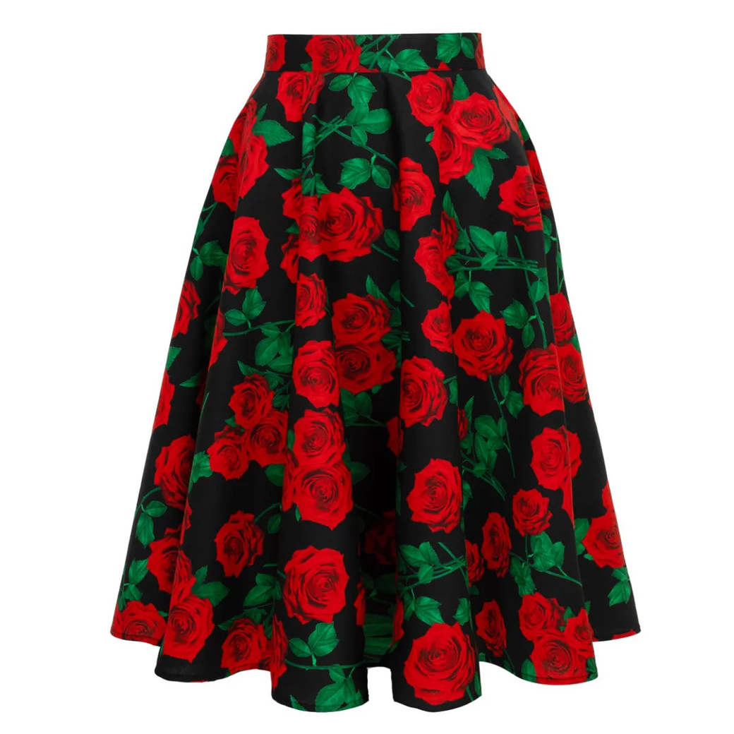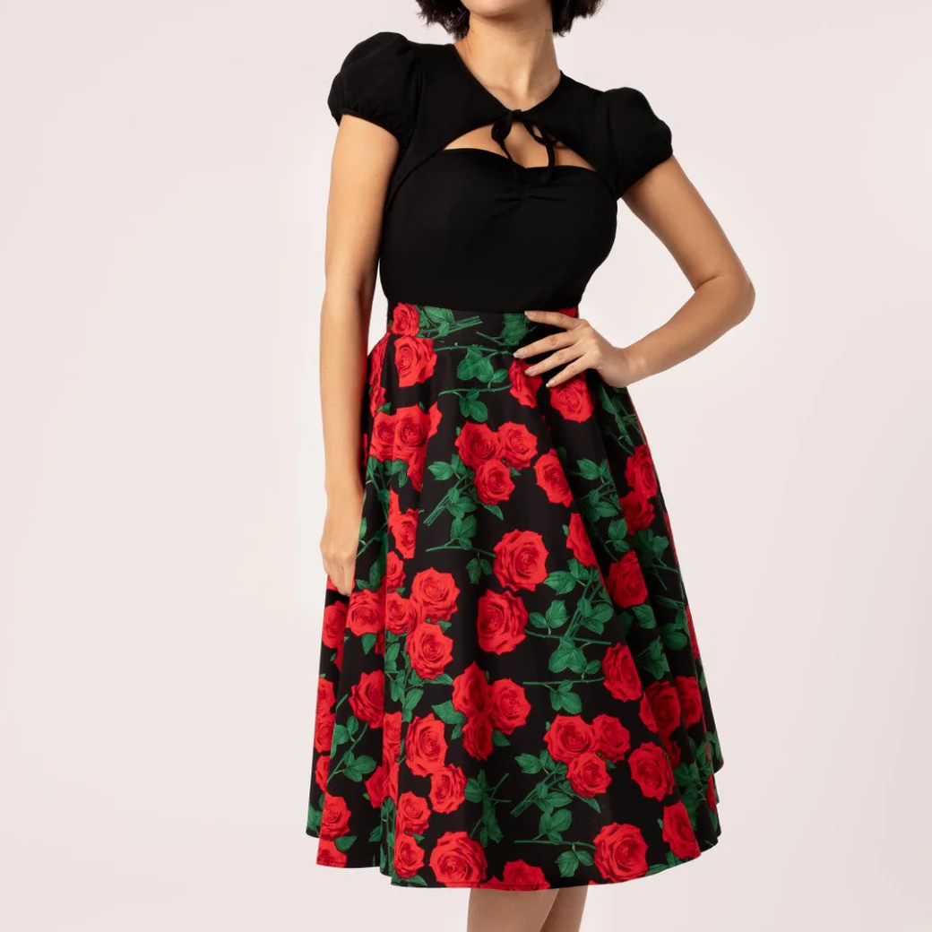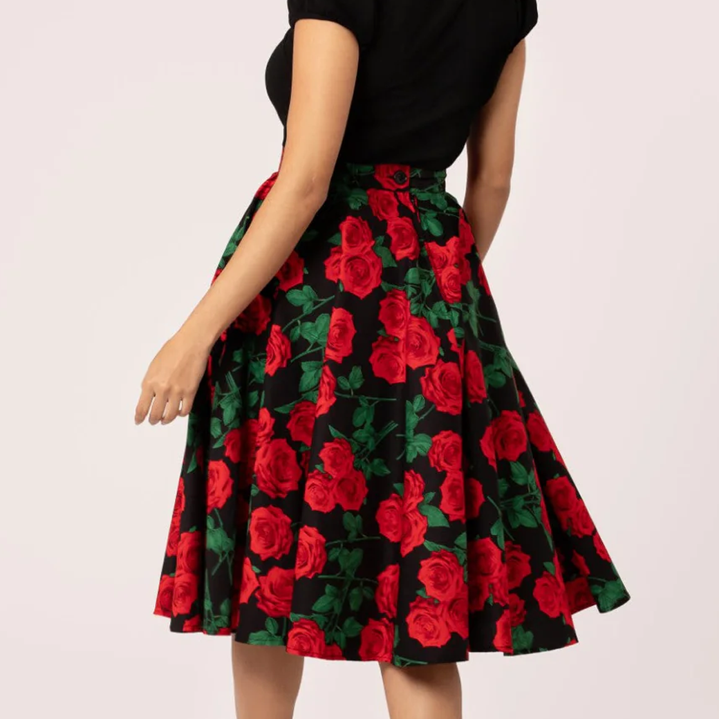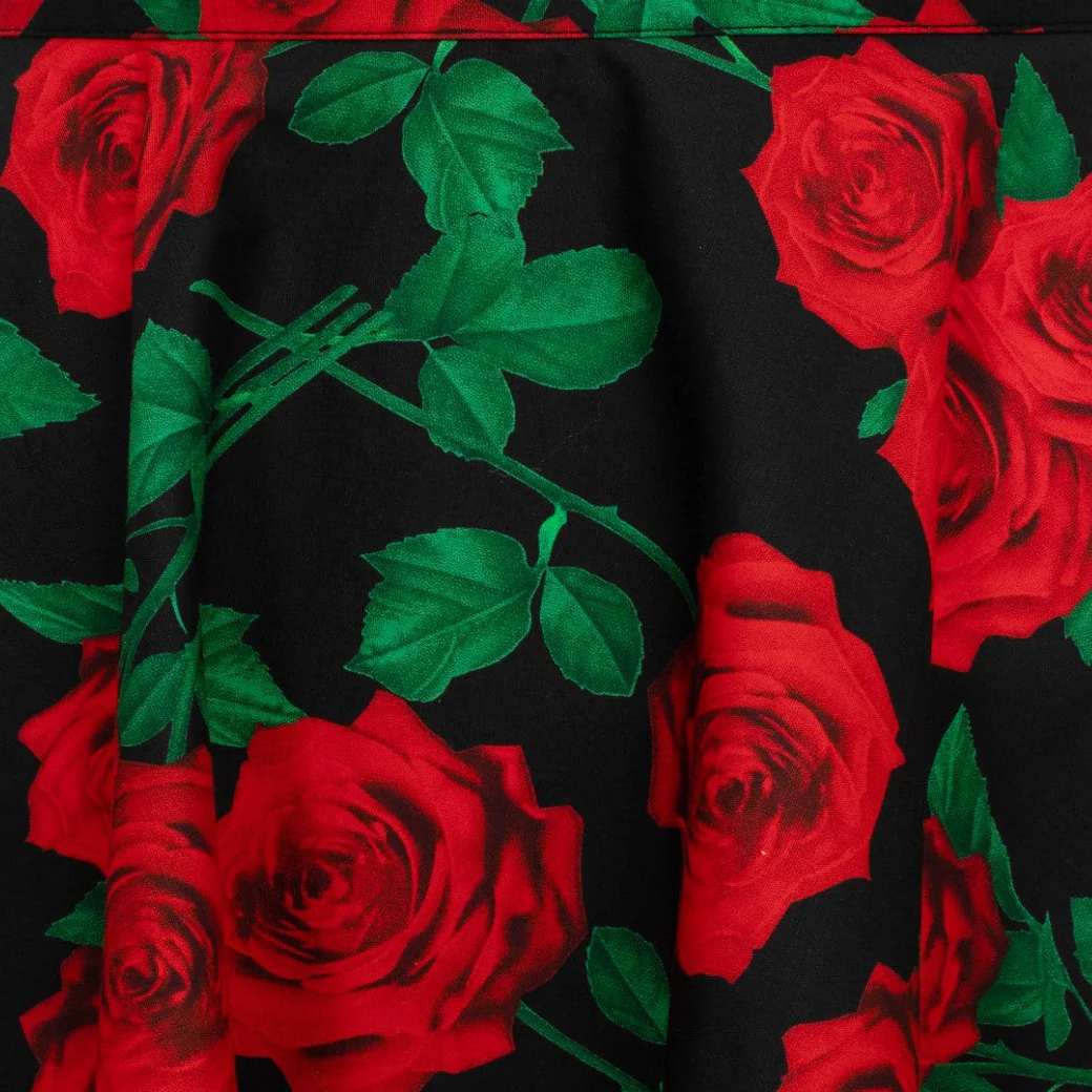 黒地に映える鮮やかな赤いバラのプリントがロマンチックなサークルスカート