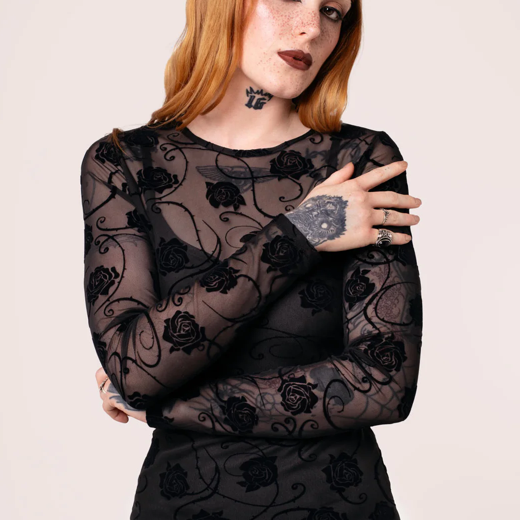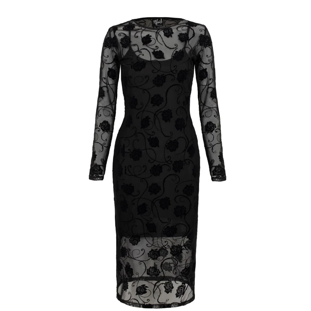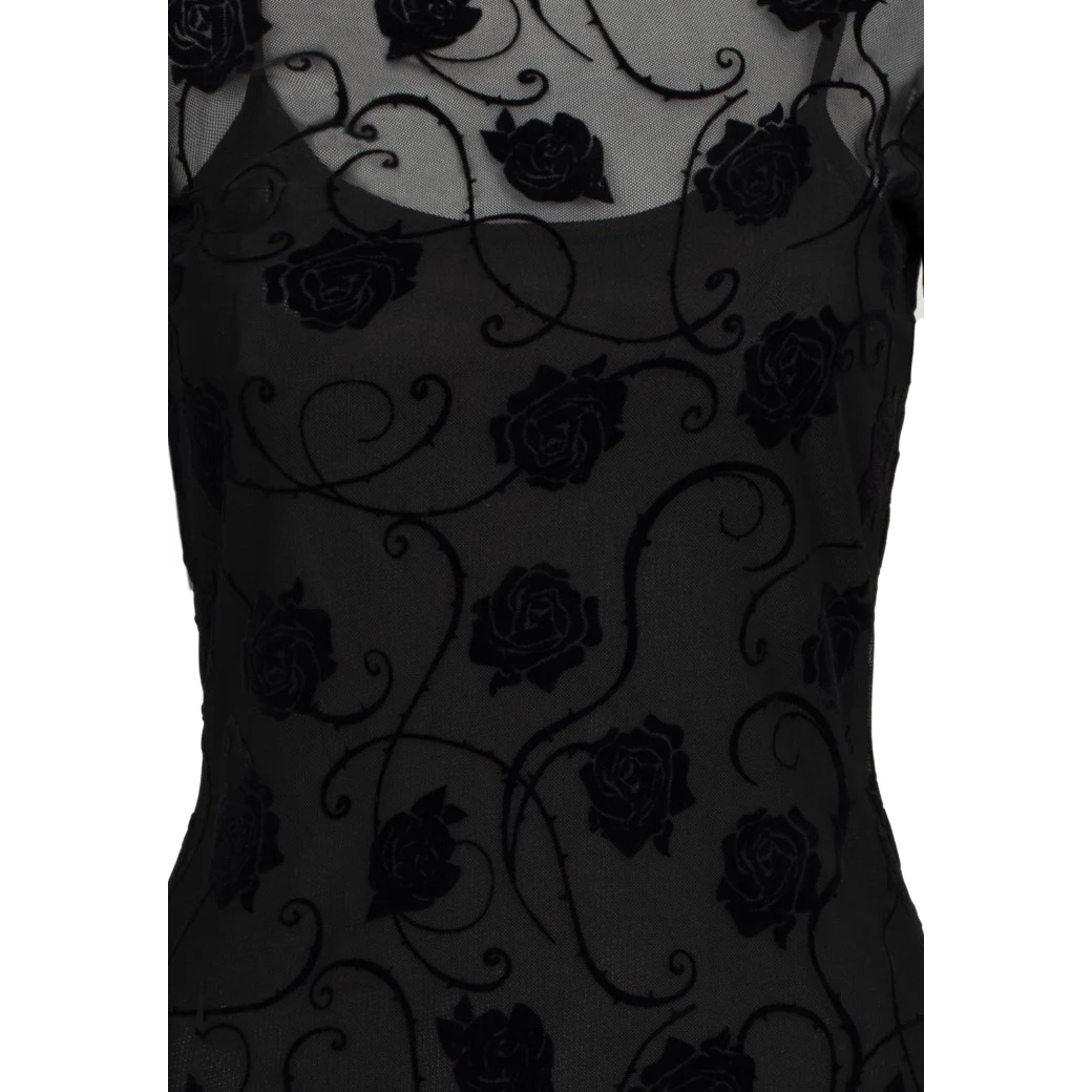 バラと絡み合う蔦のベルベットフロッキングが施されたブラックのシアーなタイトワンピース