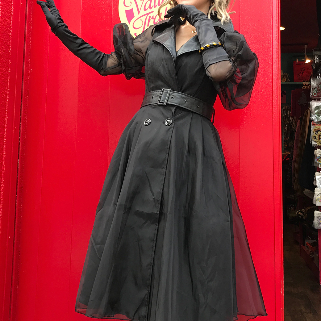 モダンなエッジを効かせたタイムレスなアイテムは、古き良きハリウッドのエレガンスを体現しています。透け感のあるオーガンジーのトップレイヤーと、光沢のあるタフタのボトムレイヤーが目を引く魅惑的なシルエットを作り出しています。レッグ・オブ・マットン・パフスタイルの袖はシアーなオーガンジー素材で、袖口はタフタ素材。フェイクレザーで作られたトレンチコートの襟は、お揃いのフェイクレザーのベルトと調和し、洗練された肘までのレザーグローブなどとも完璧にマッチします。コートのボディはダブルブレストボタンフロントで、ウエストは "ニュールック "スタイル。膝丈のフルプリーツスカートが優雅さを添え、紅葉の万華鏡のような色彩に魅了されながら、マンハッタンの街を堂々とスタイリッシュに歩くことができる。