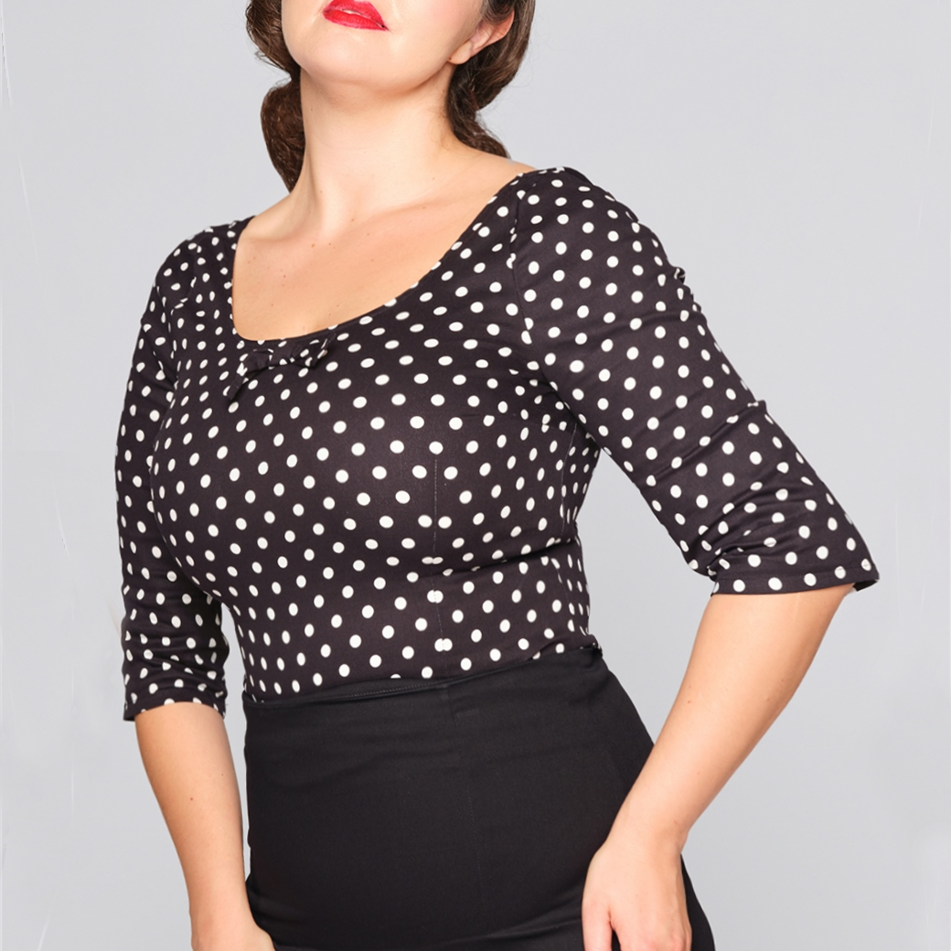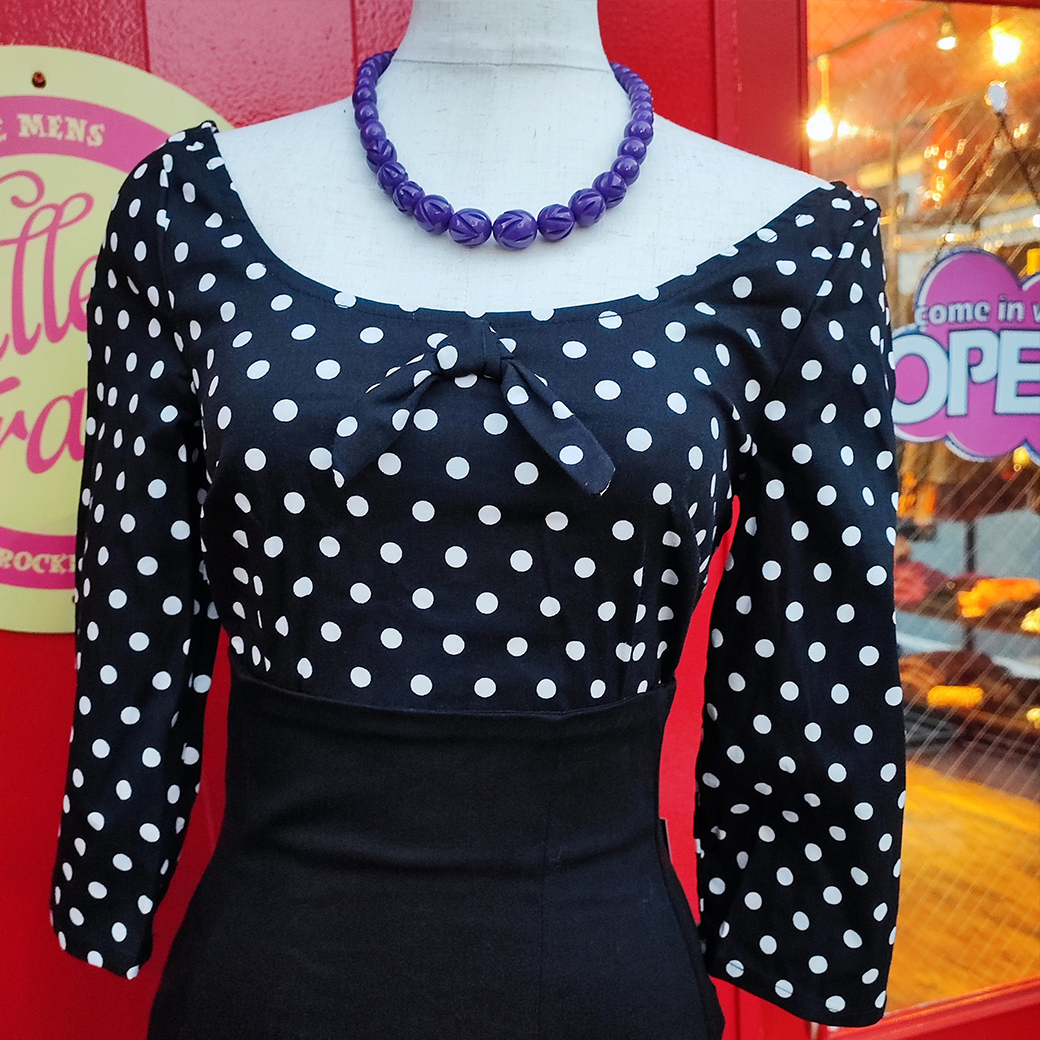 ヴィンテージレディには欠かせないドット柄のトップス。軽い伸縮性のあるコットンサテン地がボディラインをピッタリと包みクラシックなピンナップシェイプのシルエットを描きます。デコルテを美しく魅せるボートネックラインの胸元にはキュートなリボン。5分袖なのでロングシーズン、様々なシーンで活躍します。