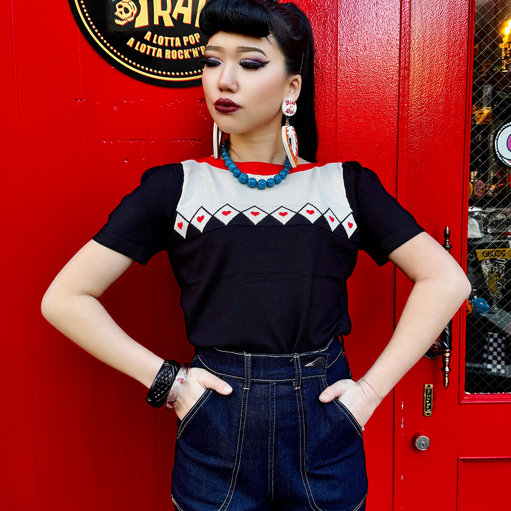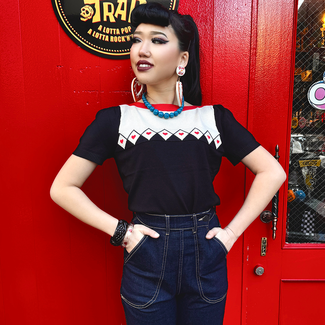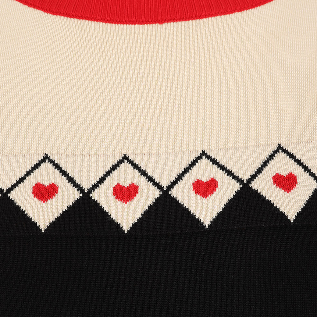 胸元のダイヤ柄とハートのパターンが遊び心のあるアクセントに