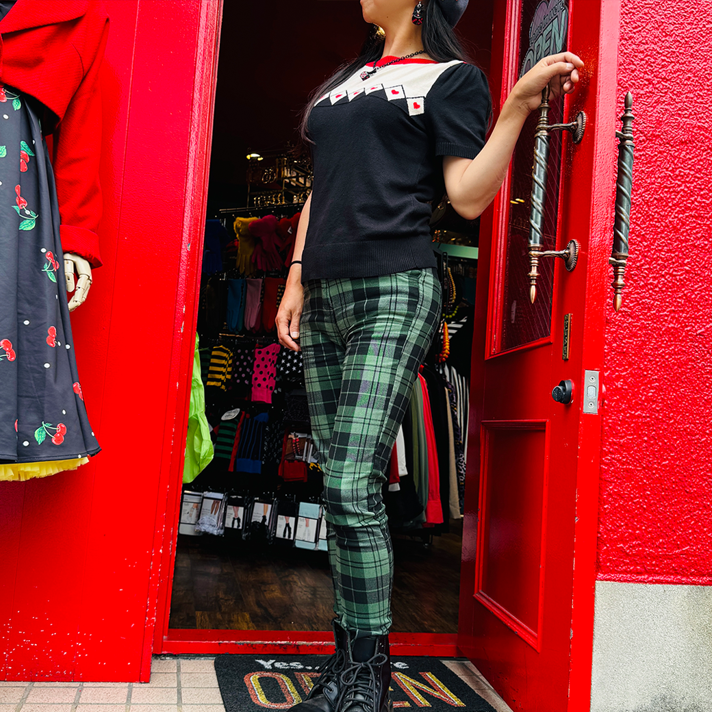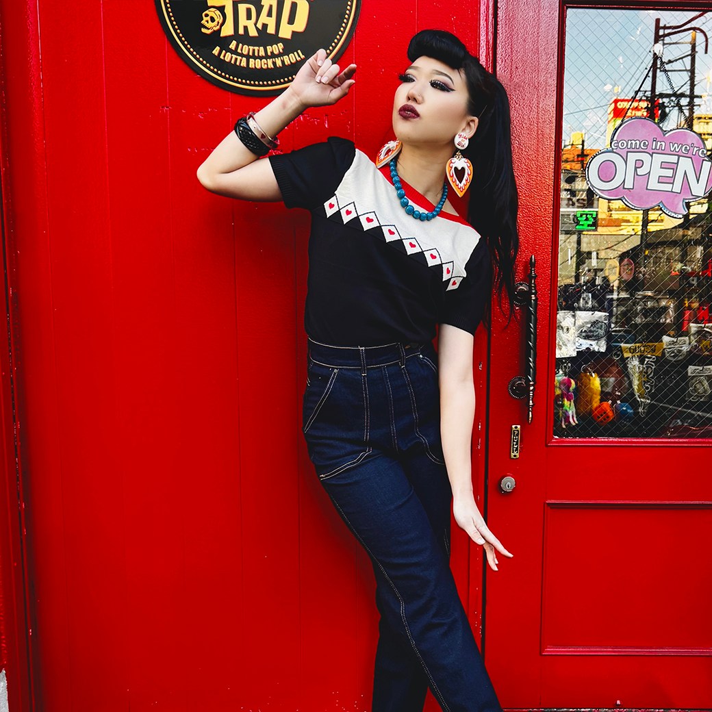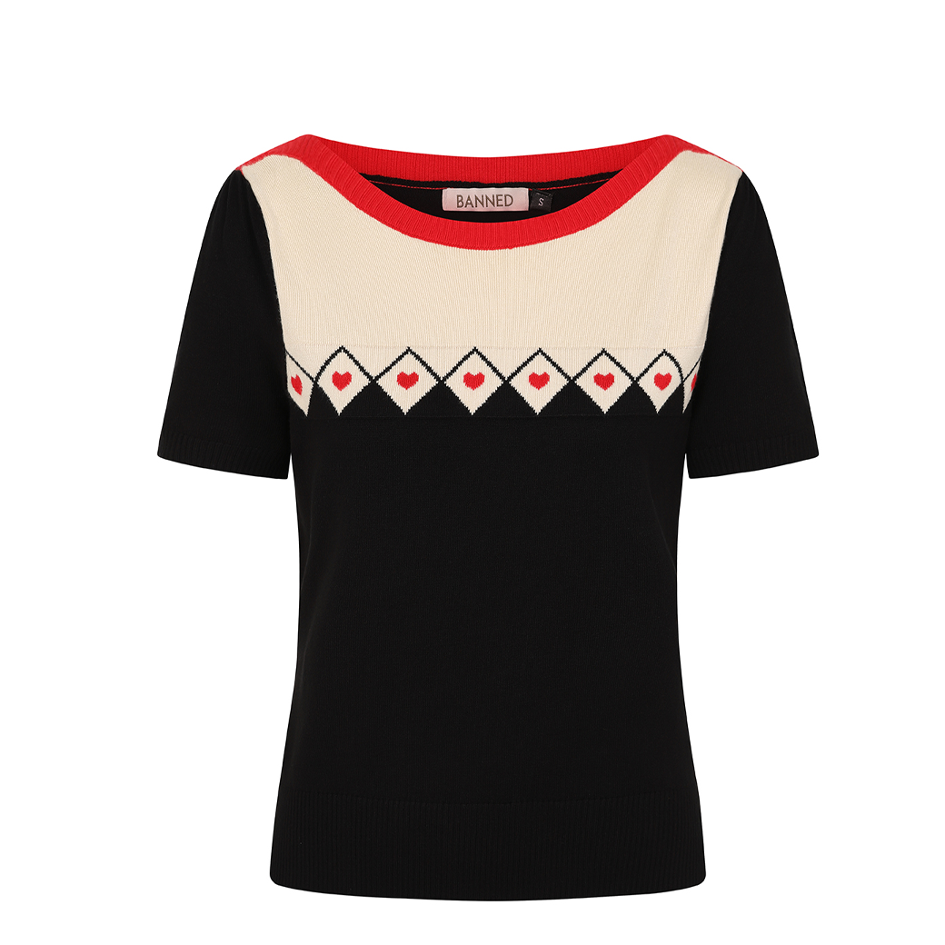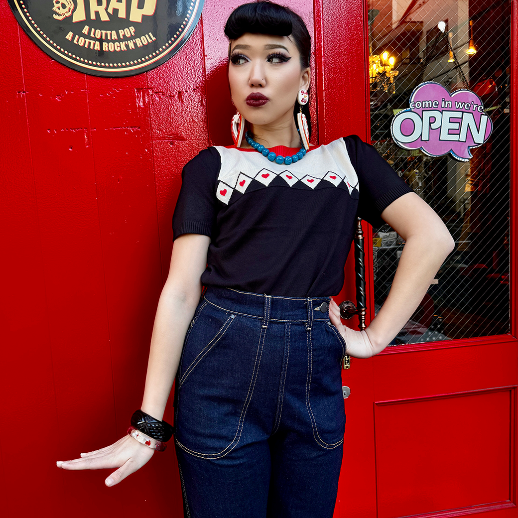 胸元のダイヤ柄とハートのパターンが遊び心のあるアクセントに