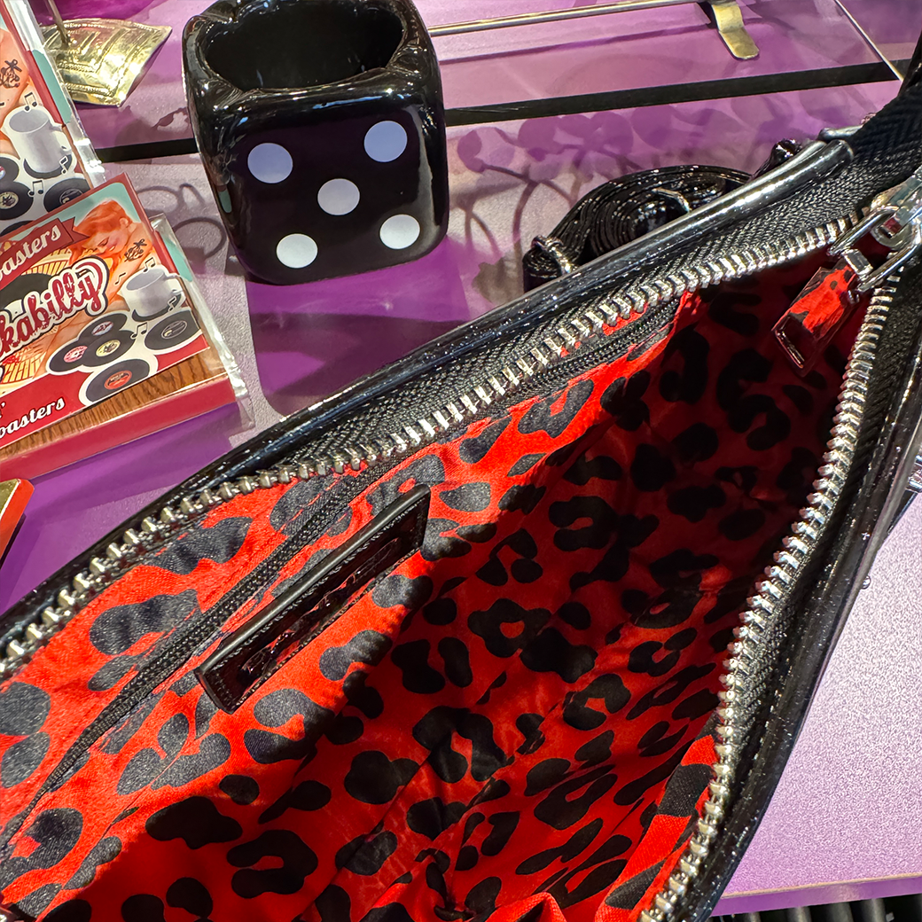 インナーは大胆な赤のレオパード柄で内ポケットも充実!