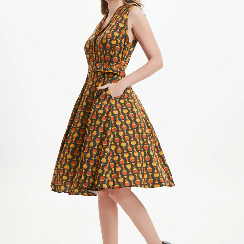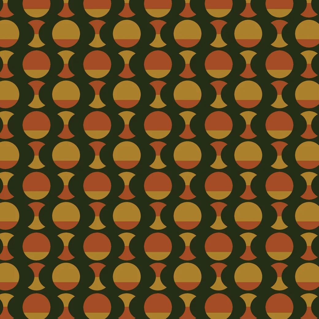 落ち着いたオリーブグリーンにかじったリンゴをイメージしたオレンジとイエローのジオメトリックプリントでレトロ感満載!